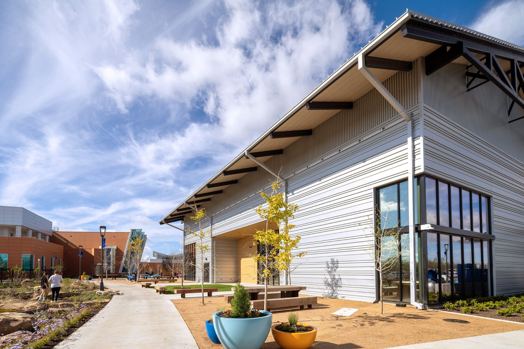 The 32,500 square foot library features two stories of bookshelves, meeting rooms, communal spaces and play areas–all designed with vibrant colors and playful shapes. The library also includes a state-of-the art makers space and spacious event rooms. The rooftop patio provides visitors with a tranquil place to gather and read while overlooking the new central plaza.